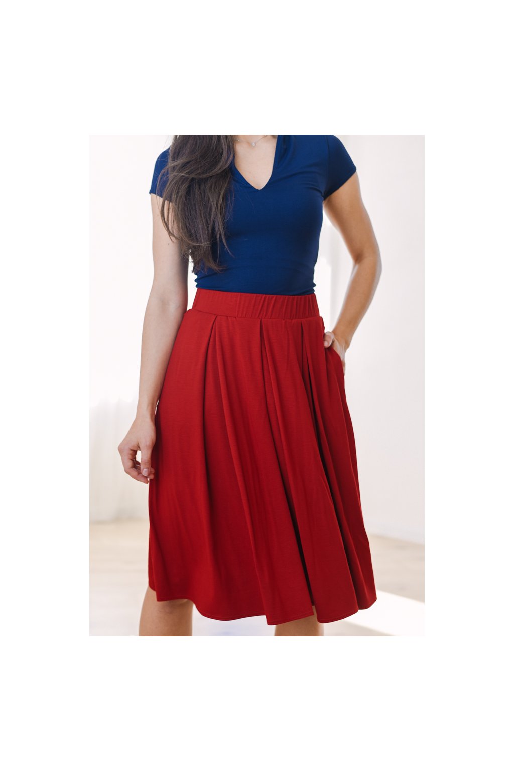 Krásná splývavá úpletová sukně s protisklady s vyším pasem.