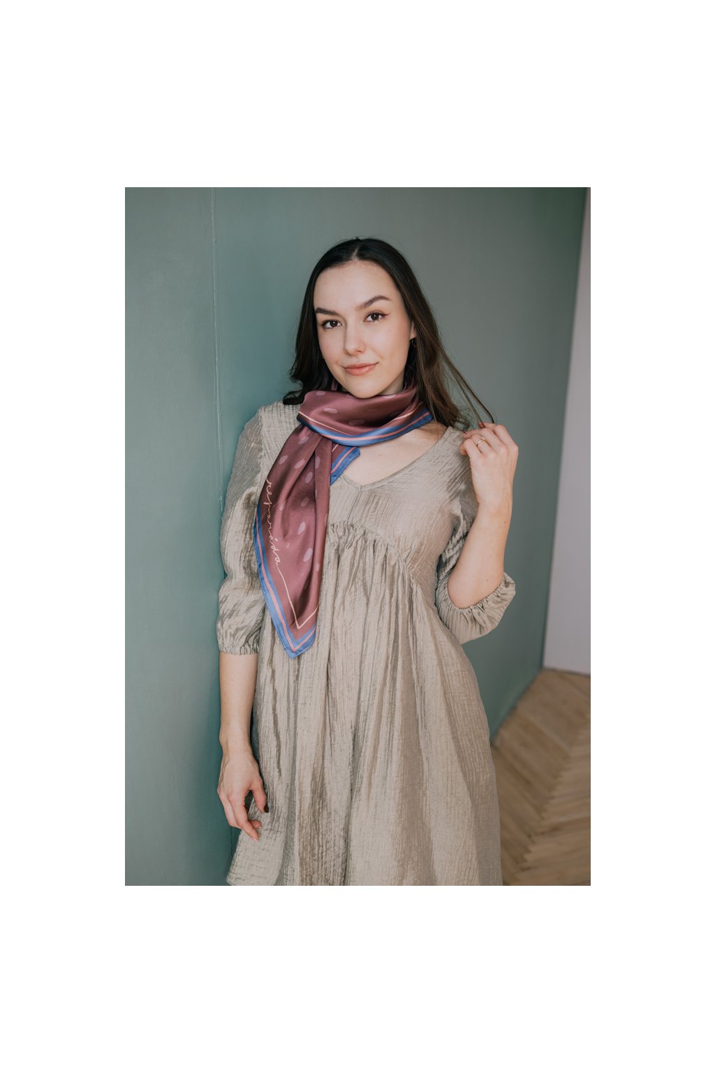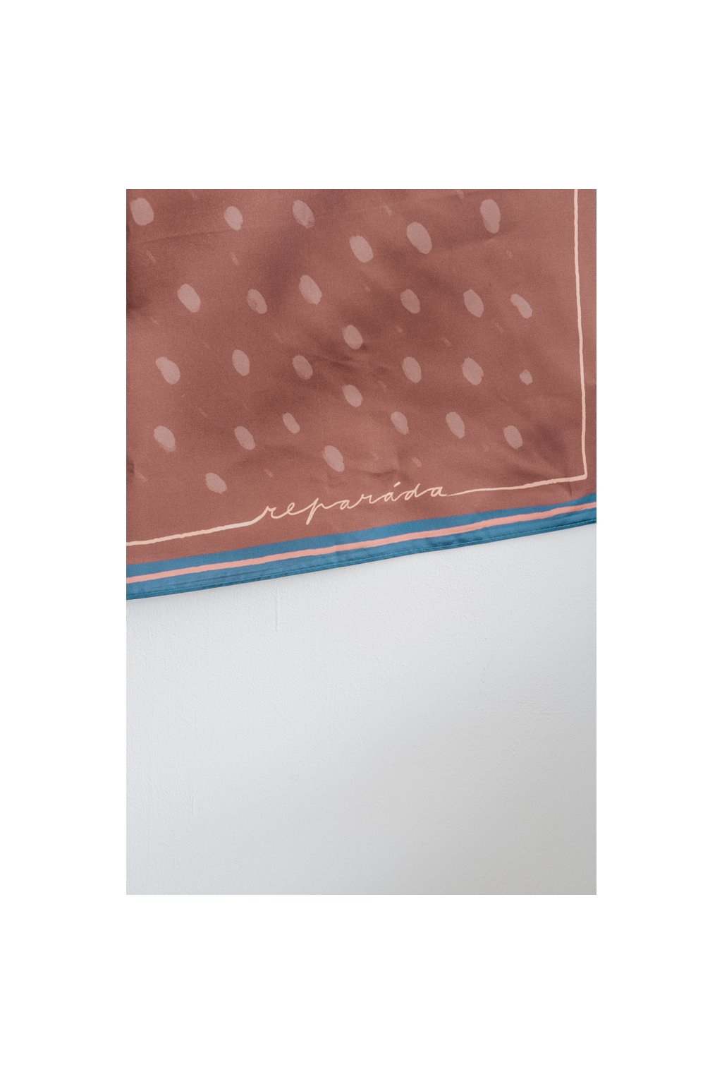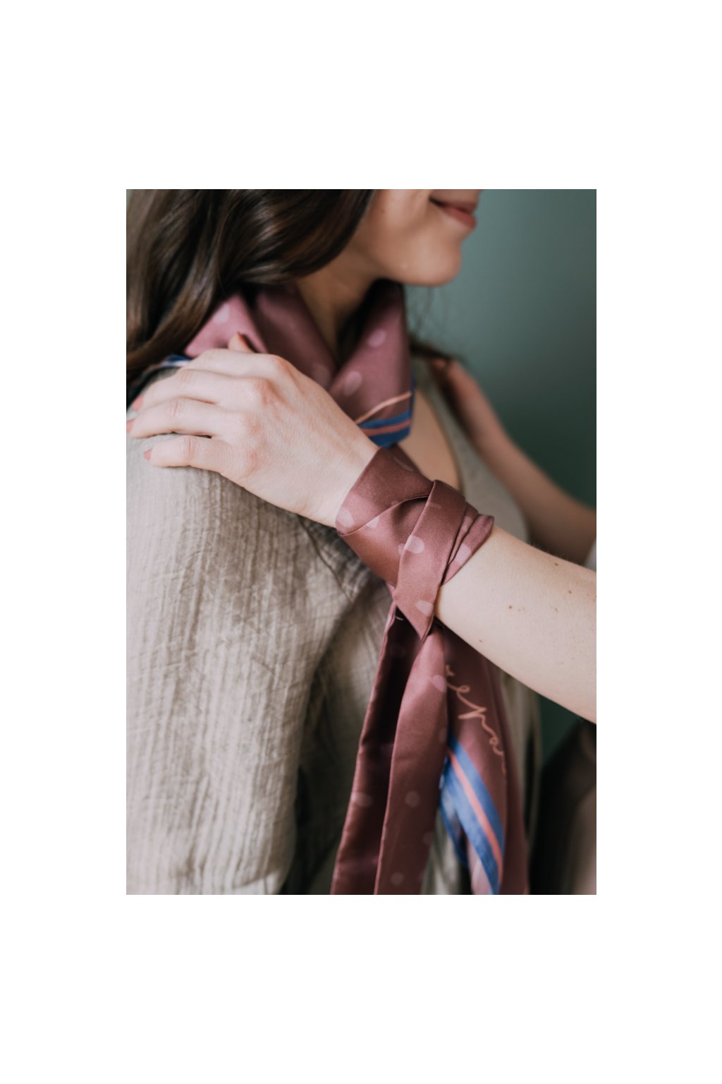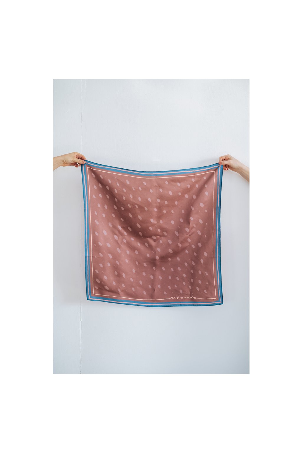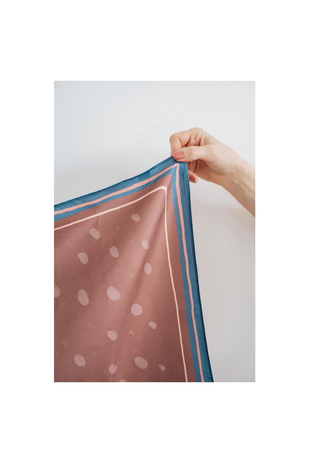 Tenhle hedvábný šátek vezmete do ruky a během chvilky oživí i ten nejjednodušší outfit. Růžové puntíky na hnědé doplňuje kontrastní modrý okraj s růžovou linkou.
