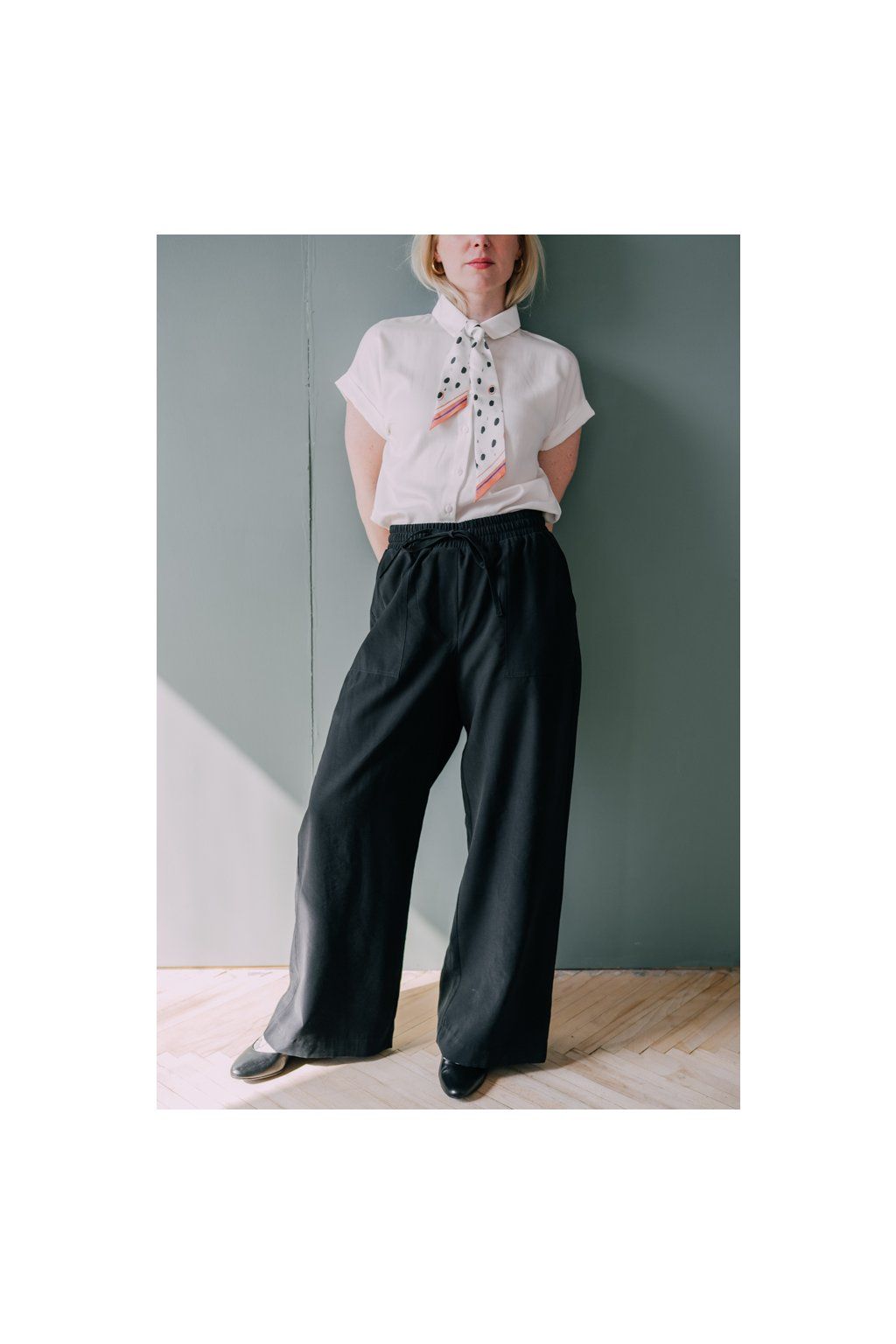 Materiál: 88 % viskóza, 12 % polyester, látka má lehce strukturovanou texturu díky způsobu tkaní (tzv. "bubble slub").