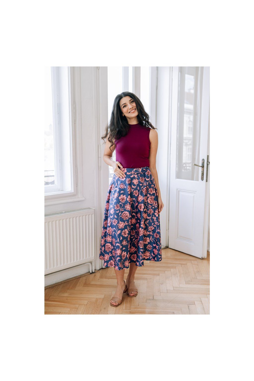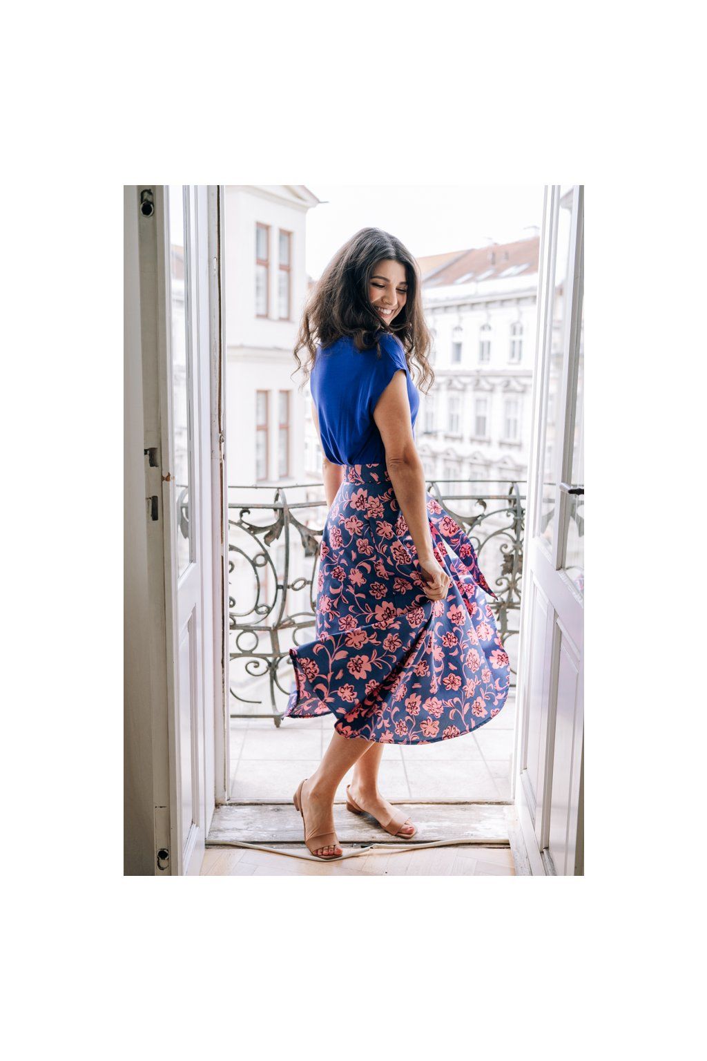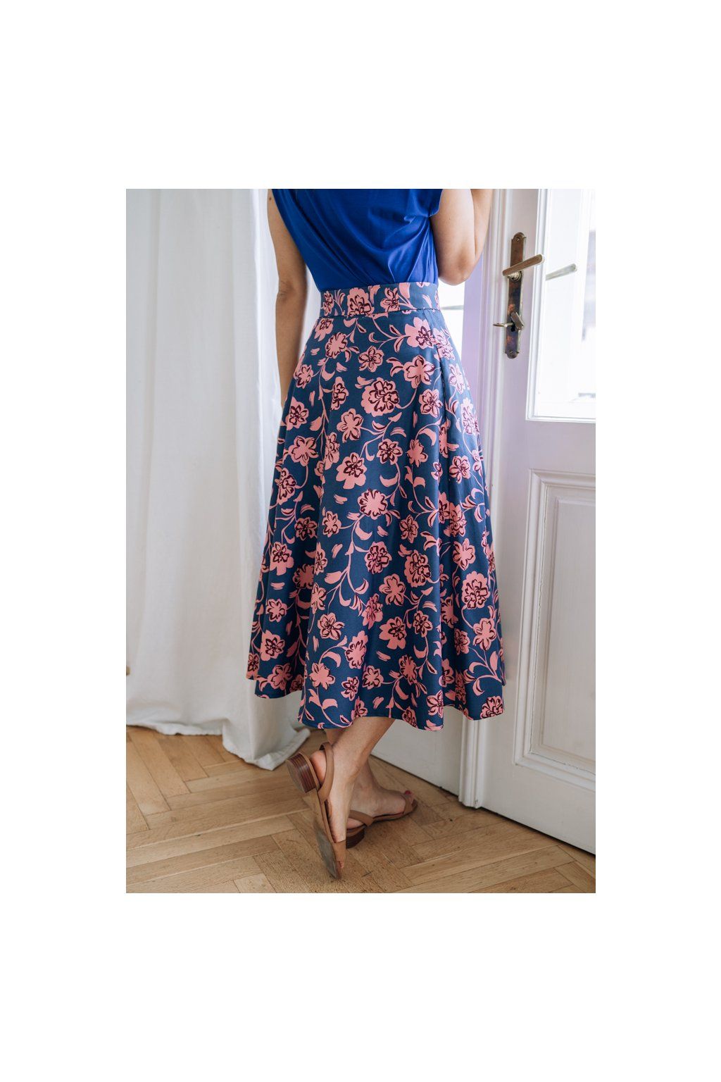Sukně Bibi midi Modrá s růžovými květy
