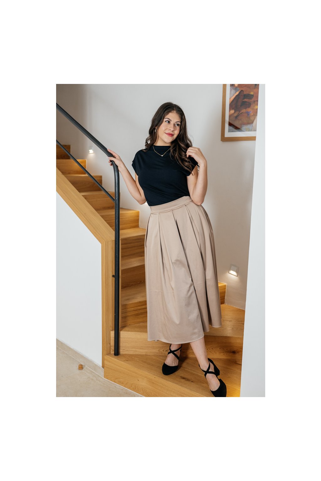 Příjemný materiál se lehounce leskne, takže si rozumí s celou řadou dalších kousků. K Marion můžete obléct tencelovou košili, top Lily, bambusové i bavlněné tričko. Dle příležitosti podpatky i tenisky.