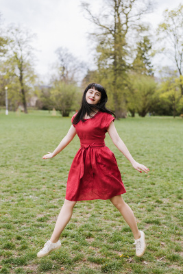 Na fotce jsou červené lněné šaty Madlen
